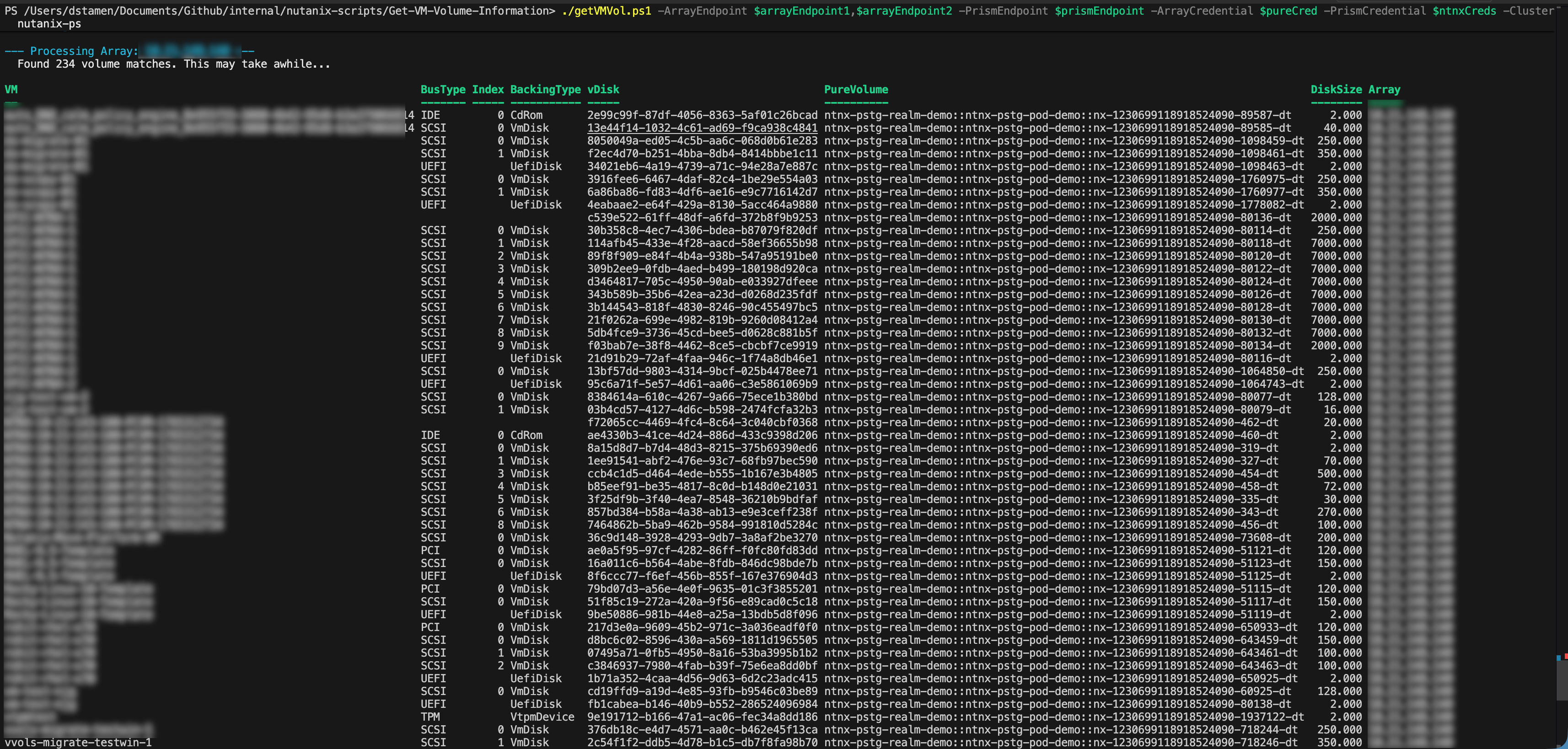 ./GetVMVol.ps1 -ArrayEndpoint $ArrayEndpoint -PrismEndpoint $PrismEndpoint -ArrayCredential $arraycred -PrismCredential $prismcred